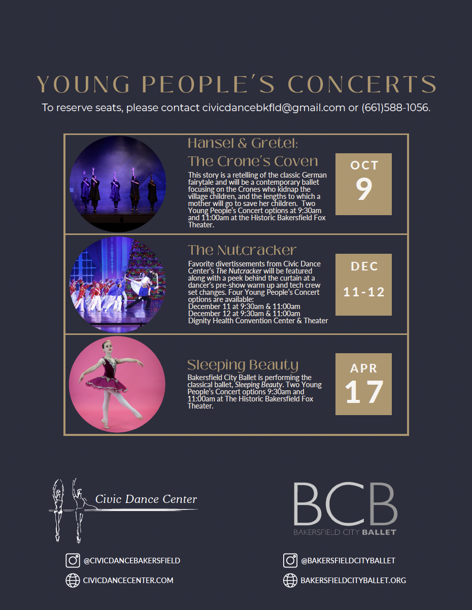 The Civic Dance Center, in partnership with the Kern County Superintendent of Schools office, annually presents its Nutcracker Young People’s Concerts for the youth of our community. The concerts are held at Mechanics Bank Convention Center at 9:30 a.m. and 11 a.m., with each performance lasting 45 minutes.